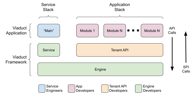 The following diagram illustrates the layers that make up the Viaduct architecture and the personas responsible for each layer: